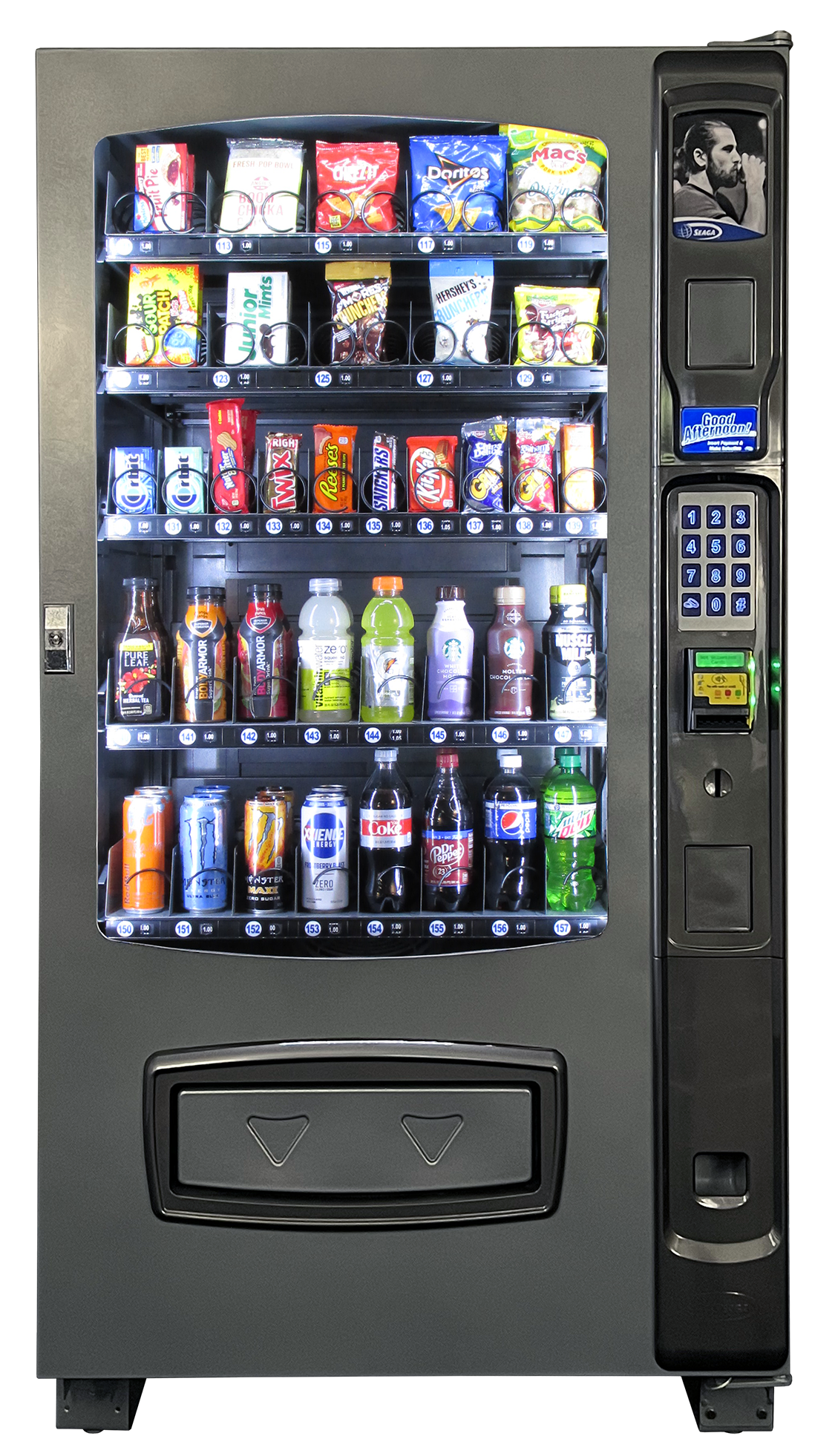 Expendedora mixta para productos empacados y bebidas frías, una máquina que cumple con las necesidades del personal propio, de paso o cautivo las 24 horas al día. Seaga, una maquina un poco más costosa con múltiples ventajas de diseño y fabricación Hecha en U.S.A. su consumo eléctrico evitara que quieran quitar tu máquina.